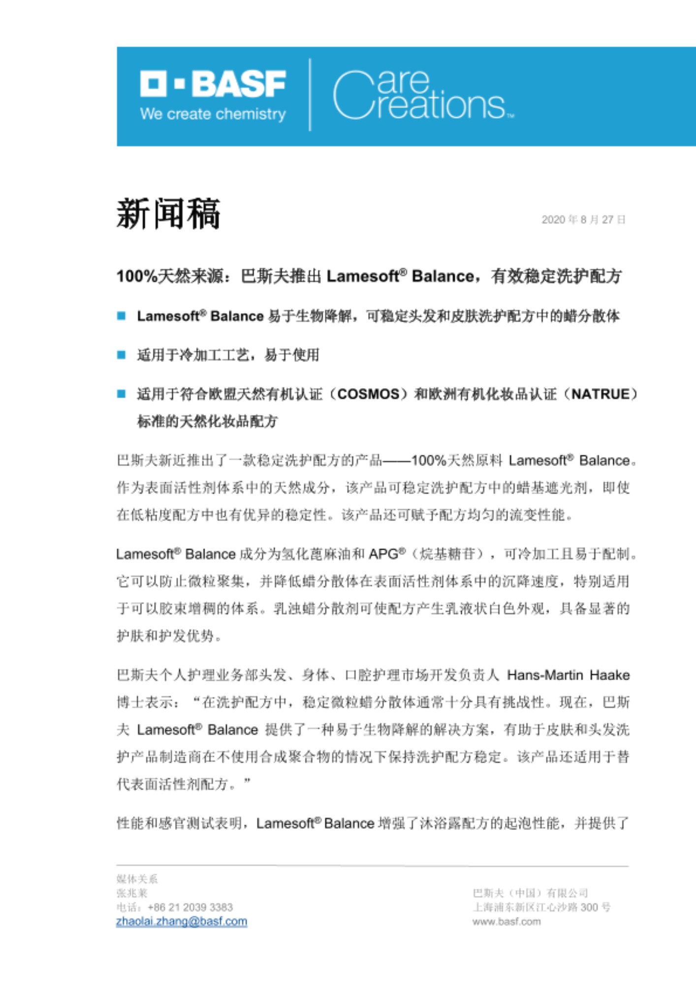 100%天然来源:巴斯夫推出Lamesoft® Balance,有效稳定洗护配方