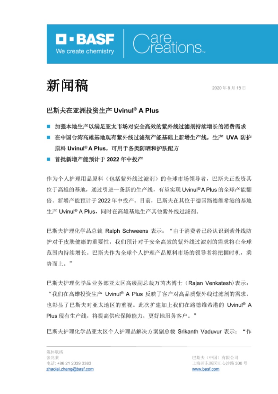 - 在中国台湾高雄基地现有紫外线过滤剂产能基础上新增生产线,生产UVA防护原料Uvinul® A Plus,可用于各类防晒和护肤配方