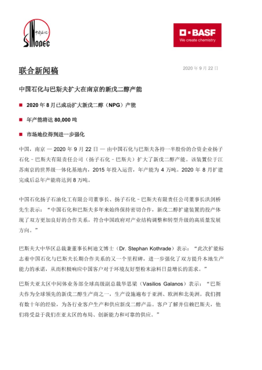 中国,南京 — 2020 年 9 月 22 日 — 由中国石化与巴斯夫各持一半股份的合资企业扬子石化–巴斯夫有限责任公司(扬子石化–巴斯夫)扩大了新戊二醇产能。该装置位于江苏南京的世界级一体化基地内,2015年投入运营,年产能为4万吨。2020年8月扩建完成后总年产能将达到 8万吨。