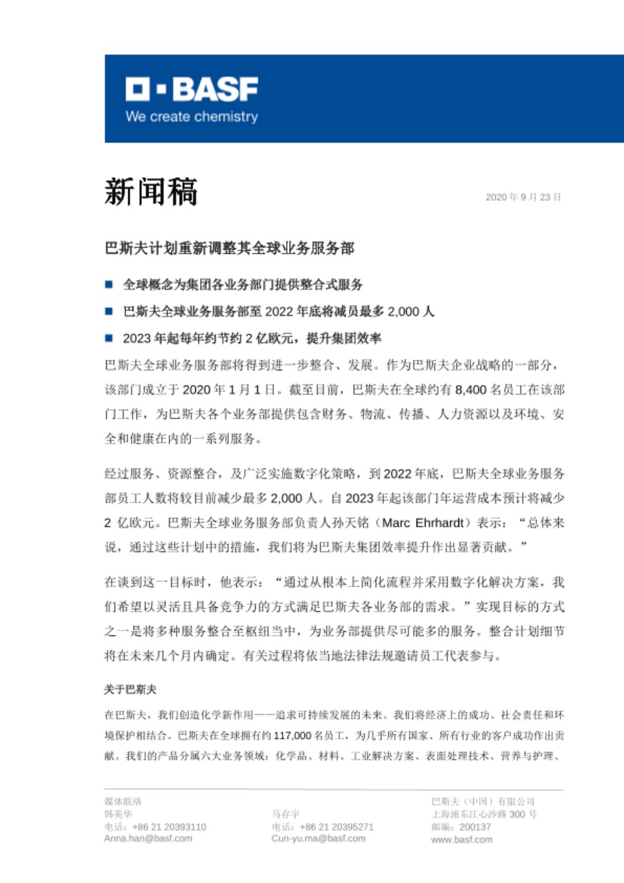 - 巴斯夫全球业务服务部至2022年底将减员最多2,000人