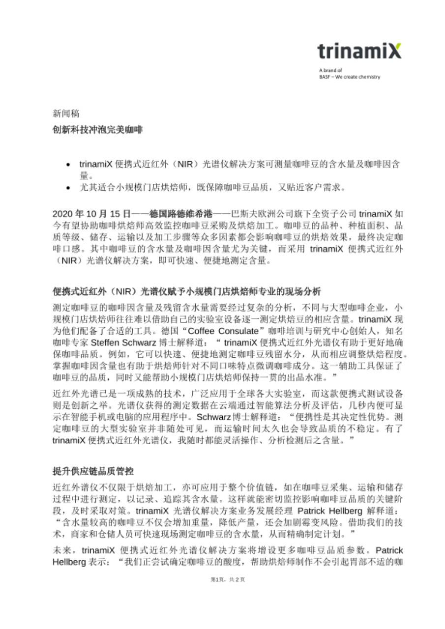 2020年10月15日——德国路德维希港——巴斯夫欧洲公司旗下全资子公司trinamiX如今有望协助咖啡烘焙师高效监控咖啡豆采购及烘焙加工。咖啡豆的品种、种植面积、品质等级、储存、运输以及加工步骤等众多因素都会影响咖啡豆的烘焙效果,最终决定咖啡口感。其中咖啡豆的含水量及咖啡因含量尤为关键,而采用trinamiX便携式近红外(NIR)光谱仪解决方案,即可快速、便捷地测定含量。