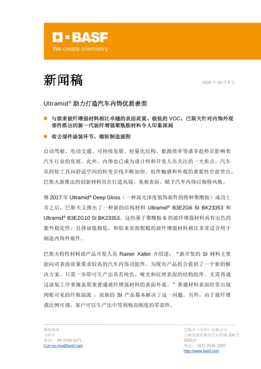 - 与原来玻纤增强材料相比卓越的表面质量、极低的VOC,巴斯夫针对内饰外观部件推出的新一代玻纤增强聚酰胺材料令人印象深刻