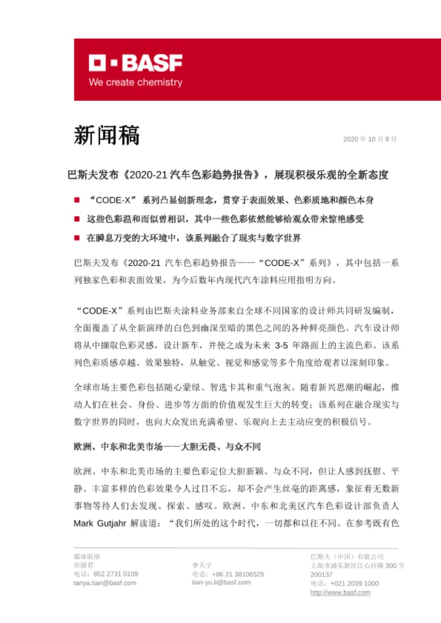 巴斯夫发布《2020-21汽车色彩趋势报告》,展现积极乐观的全新态度