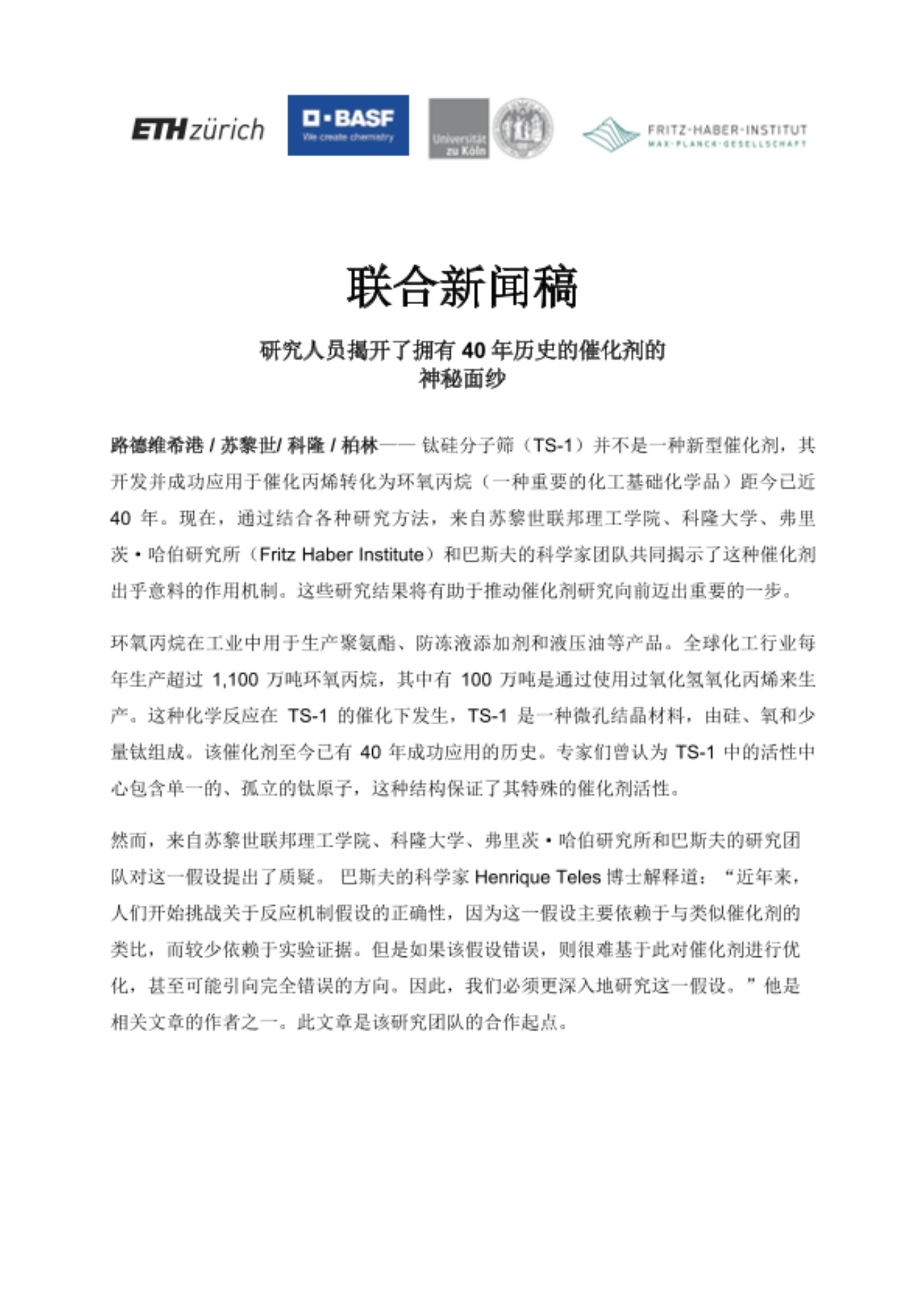 路德维希港 / 苏黎世/ 科隆 / 柏林—— 钛硅分子筛(TS-1)并不是一种新型催化剂,其开发并成功应用于催化丙烯转化为环氧丙烷(一种重要的化工基础化学品)距今已近40年。现在,通过结合各种研究方法,来自苏黎世联邦理工学院、科隆大学、弗里茨·哈伯研究所(Fritz Haber Institute)和巴斯夫的科学家团队共同揭示了这种催化剂出乎意料的作用机制。这些研究结果将有助于推动催化剂研究向前迈出重要的一步。