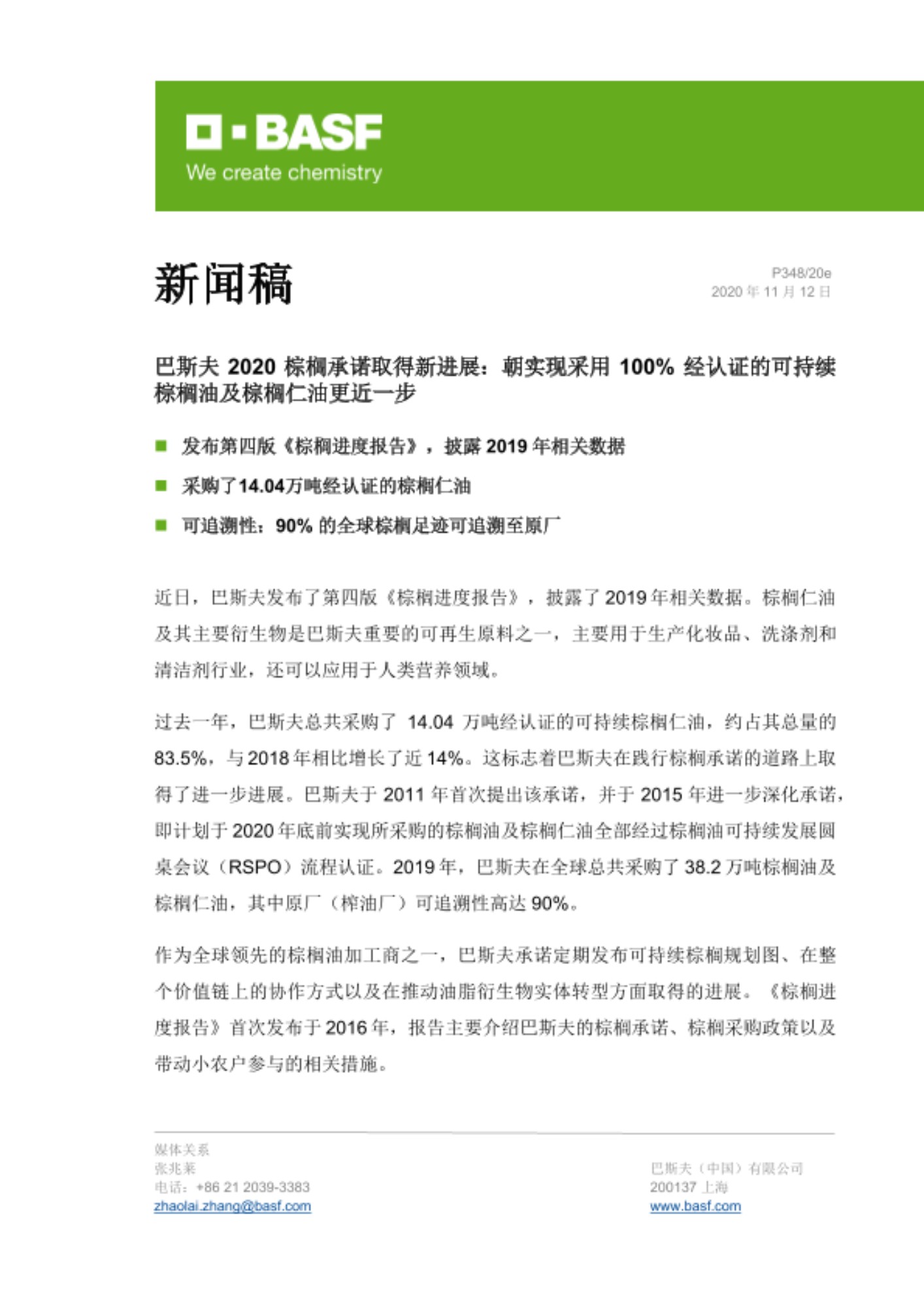 巴斯夫2020棕榈承诺取得新进展:朝实现采用100% 经认证的可持续棕榈油及棕榈仁油更近一步