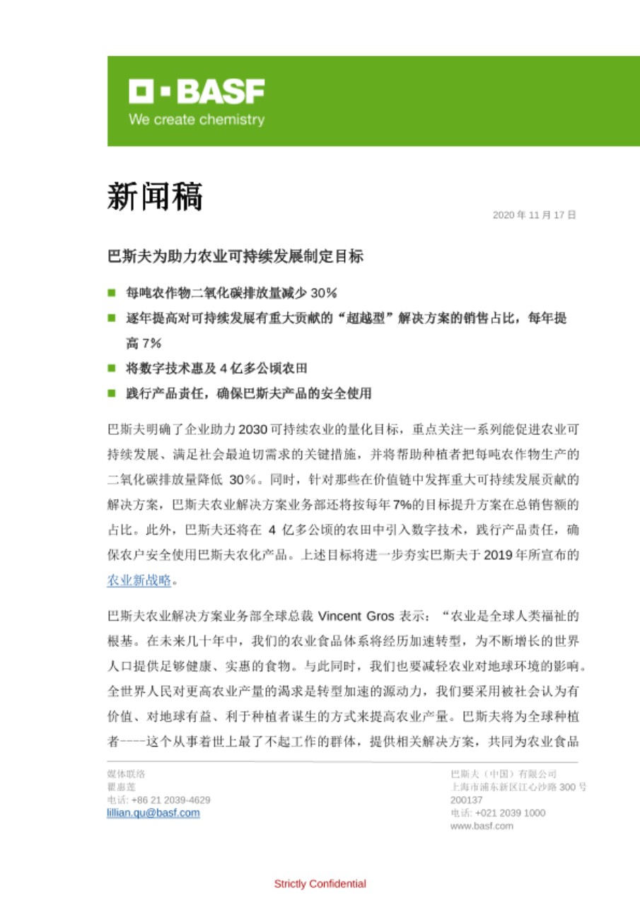 在巴斯夫,我们创造化学新作用——追求可持续发展的未来。我们将经济上的成功、社会责任和环境保护相结合。巴斯夫在全球拥有超过117,000名员工,为几乎所有国家、所有行业客户的成功作出贡献。我们的产品分属六大业务领域:化学品、材料、工业解决方案、表面处理技术、营养与护理、农业解决方案。2019年巴斯夫全球销售额约590亿欧元。巴斯夫的股票在法兰克福(BAS)证券交易所上市,并以美国存托凭证(BASFY)的形式在美国证券市场交易。欲了解更多信息,请访问:www.basf.com。