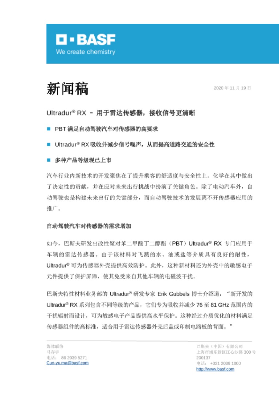 巴斯夫特性材料业务部的 Ultradur® 研发专家 Erik Gubbels 博士介绍道:“新开发的Ultradur® RX 系列包含不同等级的产品,它们专为吸收并减少76至81 GHz 范围内的干扰辐射而设计,可为敏感电子产品提供高水平保护。这种经过介质优化的材料满足传感器组件的高标准,适合用于雷达传感器外壳后盖或印制电路板的背面。”