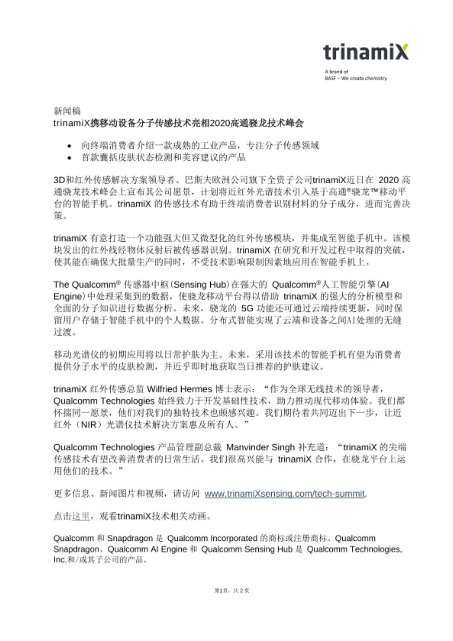 trinamiX携移动设备分子传感技术亮相2020高通骁龙技术峰会