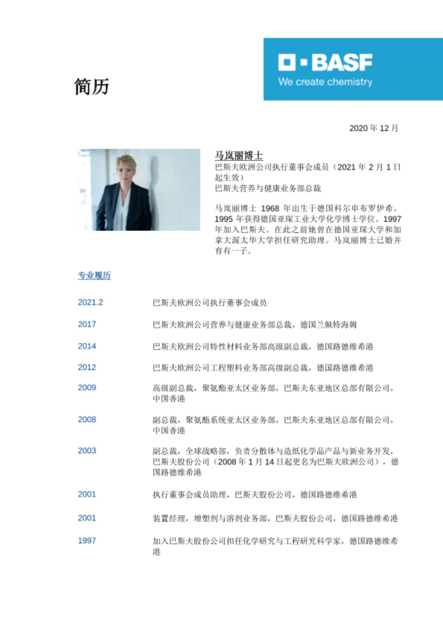 - 马岚丽博士(52岁):行业关系总监兼首席技术官,负责欧洲基地与一体化管理、全球工程服务、企业环境保护、健康与安全、先进材料与系统研究、生物科学研究、工艺研究及化学工程,以及巴斯夫新业有限责任公司。