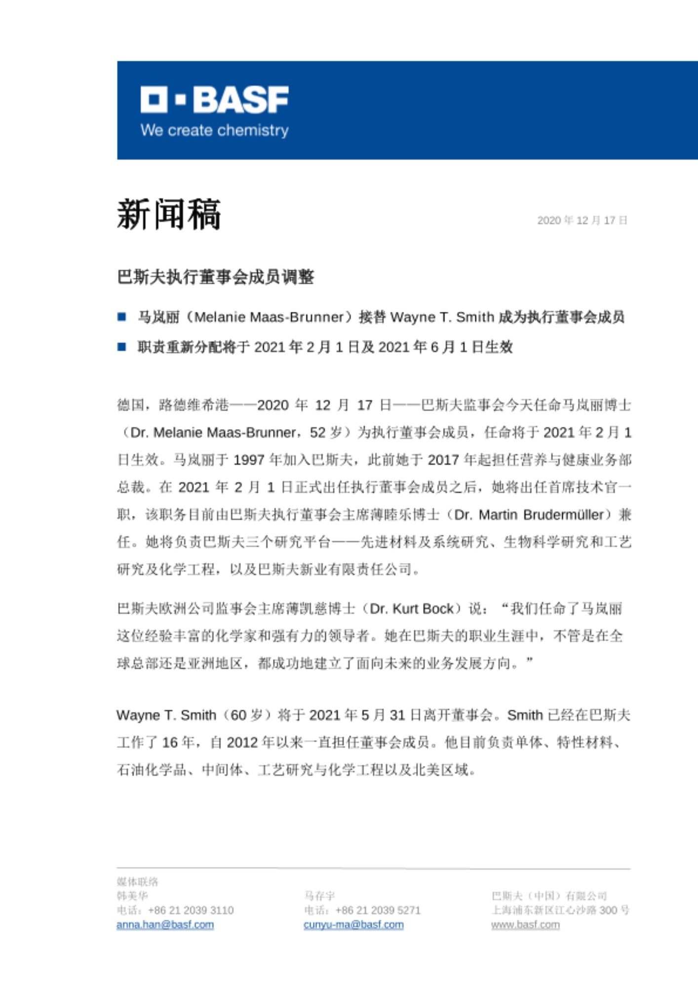 Wayne T. Smith(60岁)将于2021年5月31日离开董事会。Smith已经在巴斯夫工作了16年,自2012年以来一直担任董事会成员。他目前负责单体、特性材料、石油化学品、中间体、工艺研究与化学工程以及北美区域。