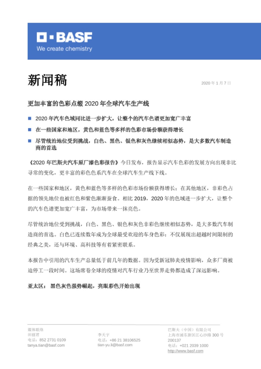 《2020年巴斯夫汽车原厂漆色彩报告》今日发布,报告显示汽车色彩的发展方向出现非比寻常的变化,更丰富的彩色色系汽车在全球汽车生产线下线。