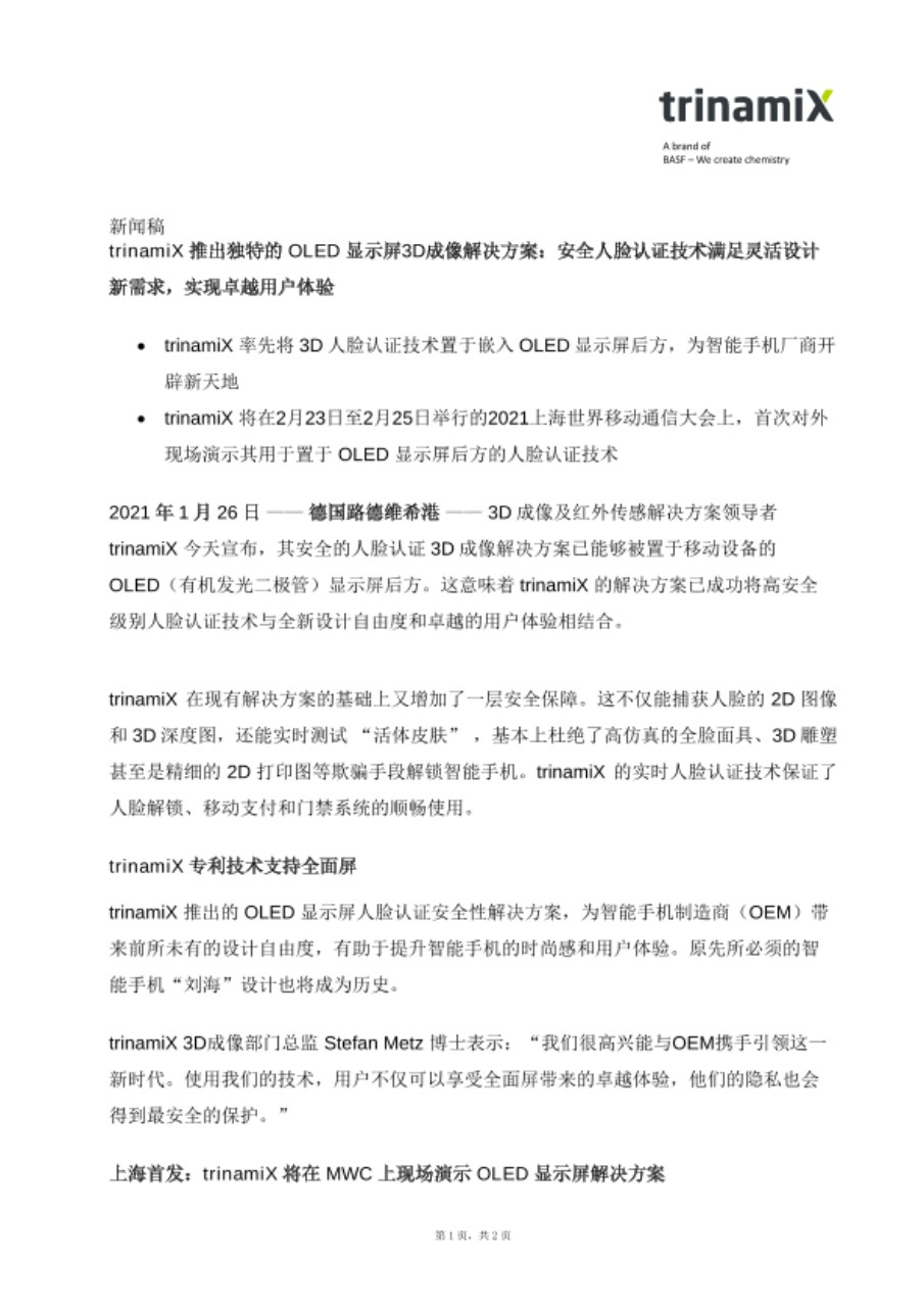 - trinamiX 将在2月23日至2月25日举行的2021上海世界移动通信大会上,首次对外现场演示其用于置于 OLED 显示屏后方的人脸认证技术