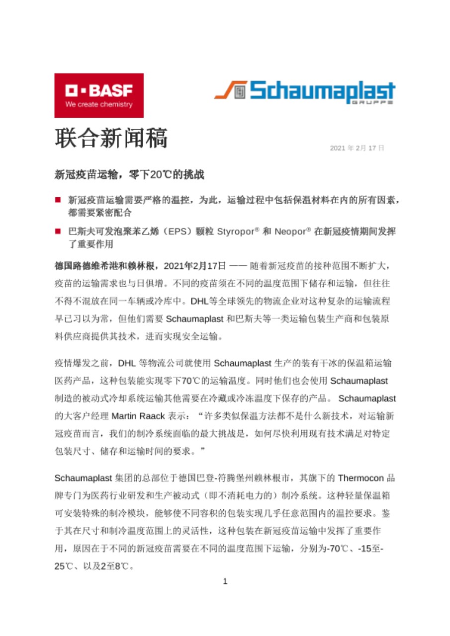 德国路德维希港和赖林根,2021年2月17日 —— 随着新冠疫苗的接种范围不断扩大,疫苗的运输需求也与日俱增。不同的疫苗须在不同的温度范围下储存和运输,但往往不得不混放在同一车辆或冷库中。DHL等全球领先的物流企业对这种复杂的运输流程早已习以为常,但他们需要 Schaumaplast 和巴斯夫等一类运输包装生产商和包装原料供应商提供其技术,进而实现安全运输。