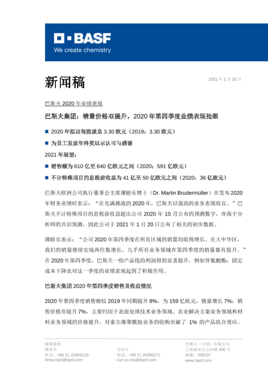 巴斯夫欧洲公司执行董事会主席薄睦乐博士(Dr. Martin Brudermüller)在发布2020年财务业绩时表示:“在充满挑战的2020年,巴斯夫以强劲的业务表现收官。”巴斯夫不计特殊项目的息税前收益超出公司2020年10月公布的预测数字,亦高于分析师的共识预测,因此公司于2021年1月20日公布了相关的初步数据。