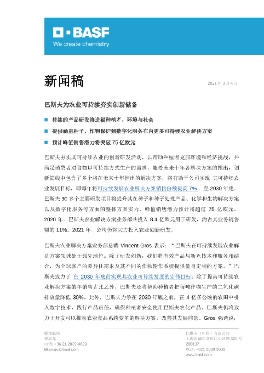 随着人口的激增,全球的未来日益取决于人类发展和保持可持续农业与健康环境的能力。巴斯夫农业解决方案部与种植户、农业专家、病虫害管理专家等各方人士合作,帮助实现这一愿景。巴斯夫农业解决方案部关注包括种子与性状、化学与生物作物保护、土壤管理、作物健康、虫害防治以及数字农业等领域的研发布局。凭借活跃在实验室、作物田、办公室和生产线等多个领域的巴斯夫专家团队,巴斯夫将创新思维与日常实践相结合,为种植户、社区乃至我们所生活的星球提供切实可行的解决方案。2020年巴斯夫农业解决方案部全球销售额达77亿欧元。欲了解更多信息,请登录www.agriculture.basf.com 或访问巴斯夫农业解决方案部的社交媒体。