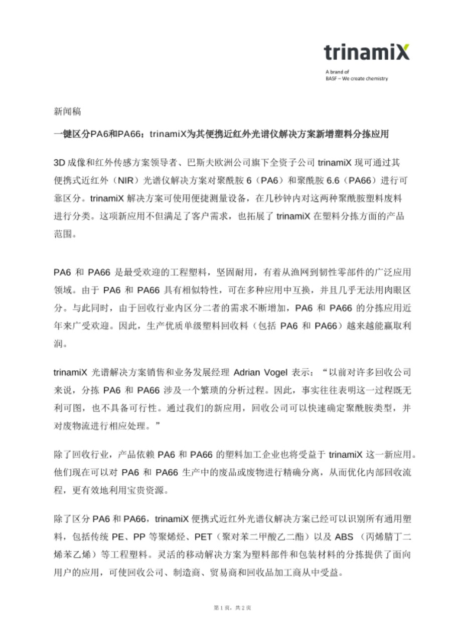 3D成像和红外传感方案领导者、巴斯夫欧洲公司旗下全资子公司 trinamiX 现可通过其便携式近红外(NIR)光谱仪解决方案对聚酰胺 6(PA6)和聚酰胺 6.6(PA66)进行可靠区分。trinamiX 解决方案可使用便捷测量设备,在几秒钟内对这两种聚酰胺塑料废料进行分类。这项新应用不但满足了客户需求,也拓展了 trinamiX 在塑料分拣方面的产品范围。