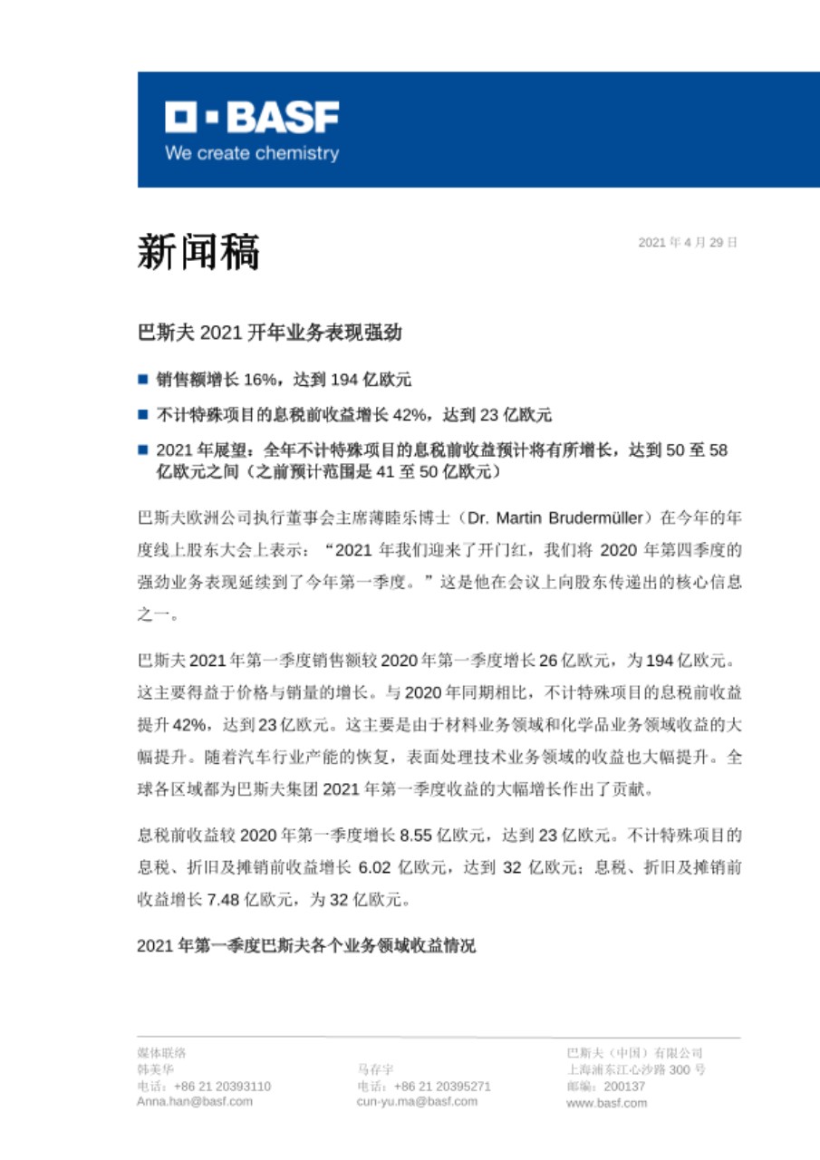 有关巴斯夫集团2021年第一季度业务发展的更多信息,可在今天公布的季度报表中找到:basf.com/quarterlystatement。