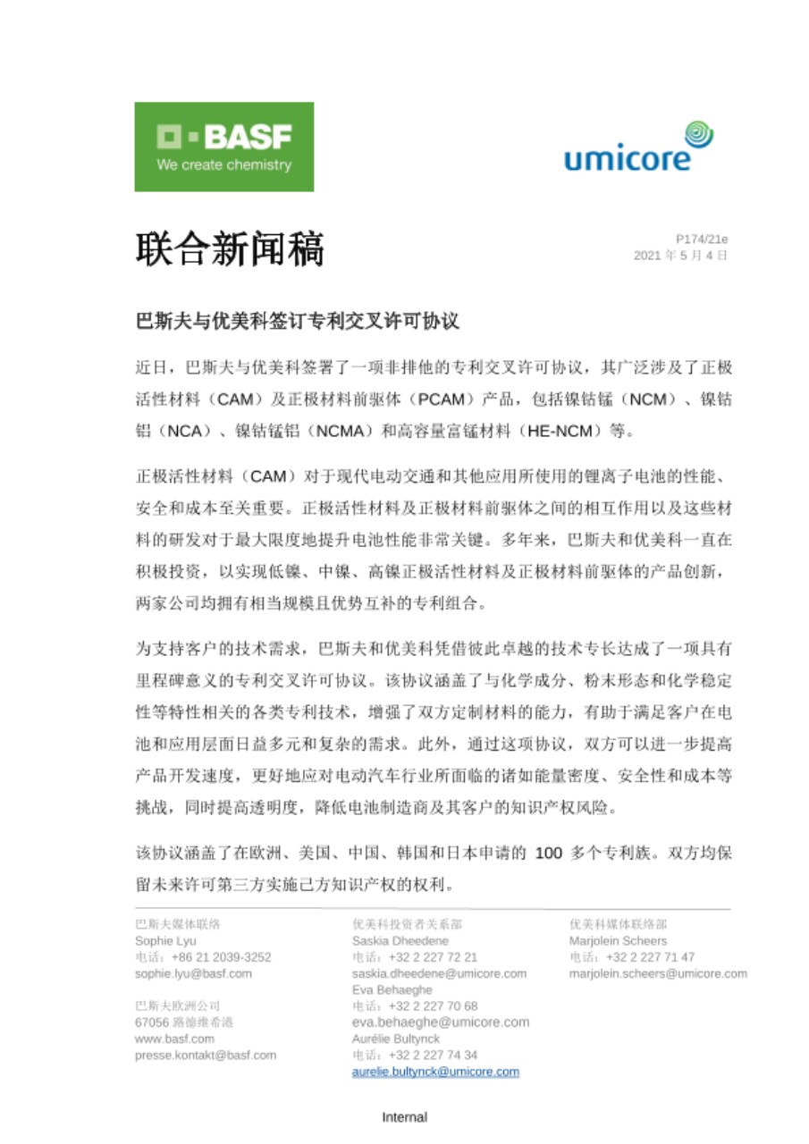 巴斯夫催化剂业务部总裁彼得·舒马赫博士表示:“与优美科达成的这一协议,将助力实现更快速、更可持续、更具创新性的电池材料开发,服务于我们的电池和汽车客户。电池材料的不断发展将全面加速电气化转型,从而帮助世界更好地应对气候变化。”