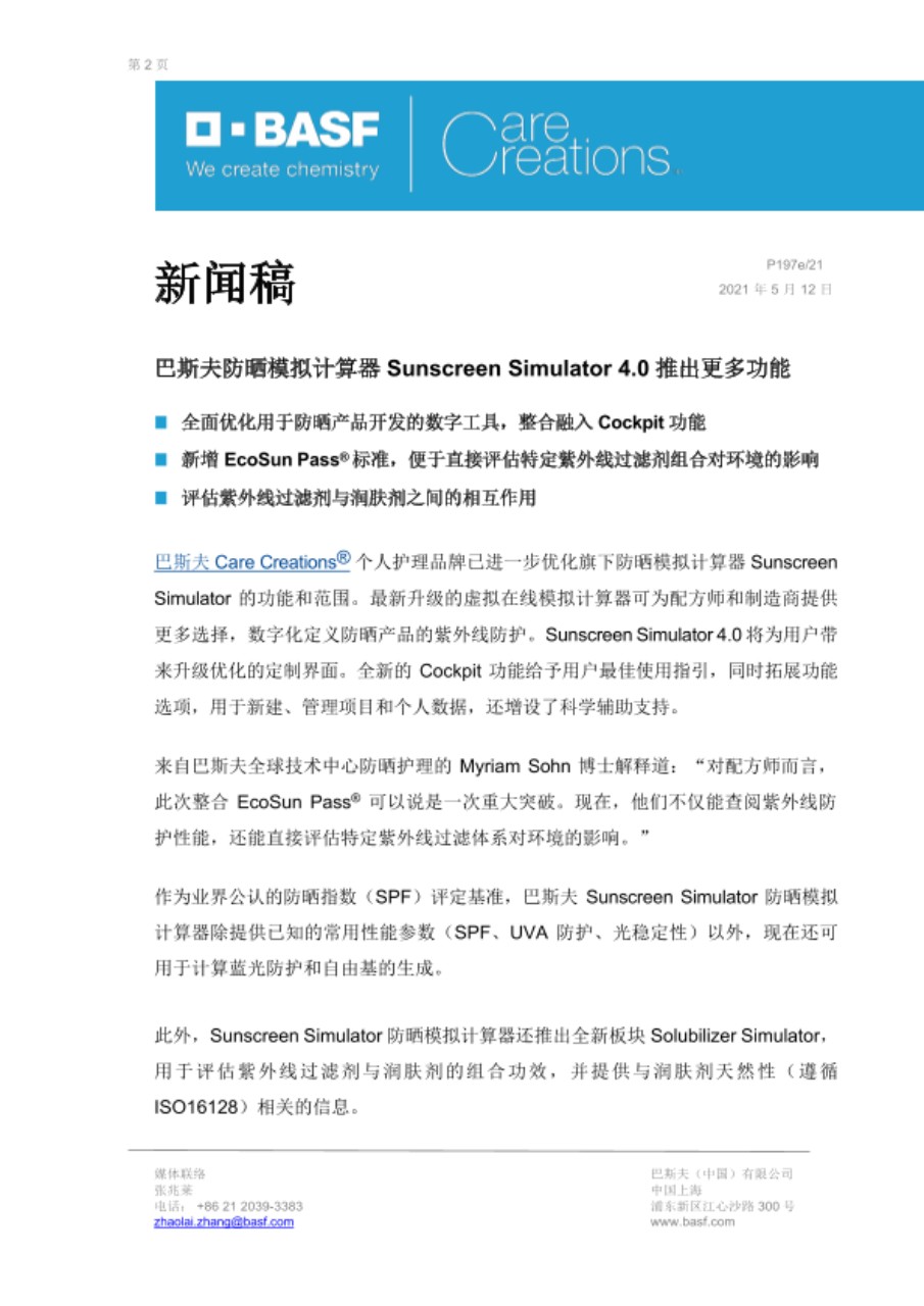 巴斯夫 Care Creations® 个人护理品牌已进一步优化旗下防晒模拟计算器 Sunscreen Simulator 的功能和范围。最新升级的虚拟在线模拟计算器可为配方师和制造商提供更多选择,数字化定义防晒产品的紫外线防护。Sunscreen Simulator 4.0 将为用户带来升级优化的定制界面。全新的Cockpit功能给予用户最佳使用指引,同时拓展功能选项,用于新建、管理项目和个人数据,还增设了科学辅助支持。