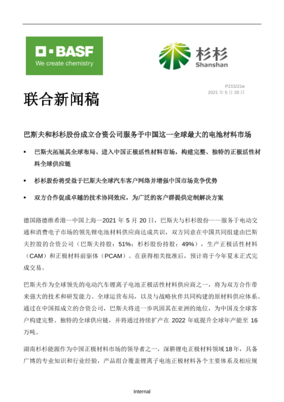德国路德维希港—中国上海—2021年5月20日,巴斯夫与杉杉股份——服务于电动交通和消费电子市场的领先锂电池材料供应商达成共识,双方同意在中国共同组建由巴斯夫控股的合资公司(巴斯夫持股:51%;杉杉股份持股:49%),生产正极活性材料(CAM)和正极材料前驱体(PCAM)。在获得相关批准后,预计将于今年夏末正式完成交易。