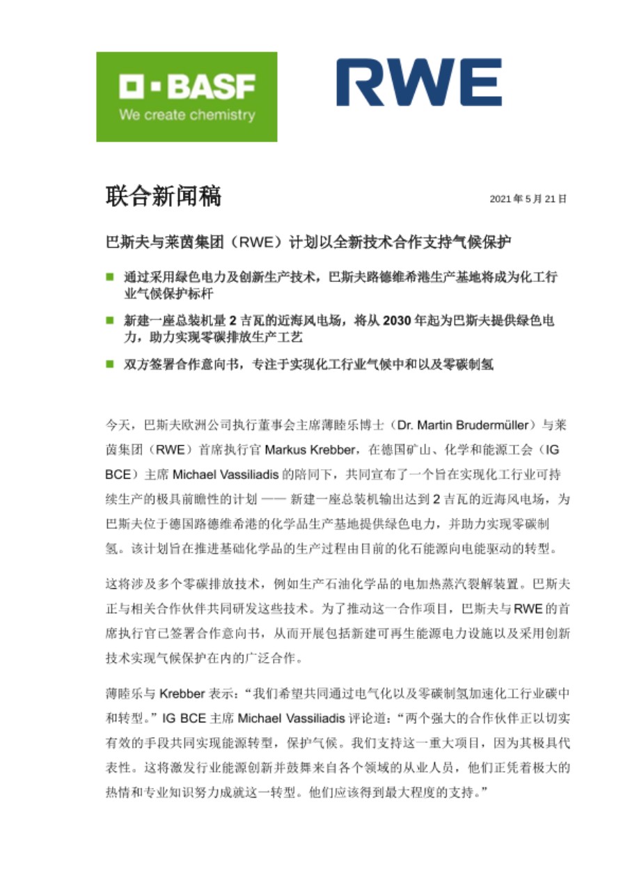 巴斯夫欧洲公司执行董事会主席薄睦乐强调:“如果没有充足的具有价格优势的可再生电力,未来的转型便无从谈起!成功来自于政府与行业间紧密、创新的合作,以及整个产业链上的协作。电力行业领军企业RWE与化工行业领先企业巴斯夫携手,为变革提供了必要的先决条件。”
