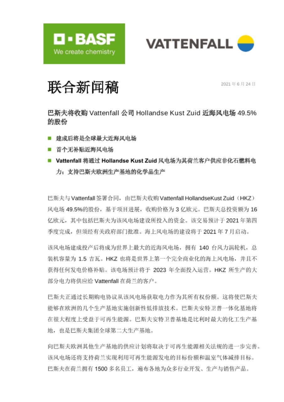 巴斯夫与Vattenfall签署合同,由巴斯夫收购Vattenfall HollandseKust Zuid(HKZ)风电场49.5%的股份,基于项目进展,收购价格为3亿欧元。巴斯夫总投资额为16亿欧元,其中包括巴斯夫为该风电场建设所投入的资金。该交易预计于2021年第四季度完成,但须经有关政府部门批准。海上风电场的建设将于2021年7月启动。