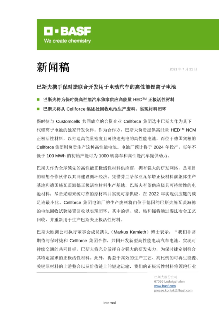 巴斯夫欧洲公司执行董事会成员凯礼(Markus Kamieth)博士表示:“我们非常期待与保时捷和 Cellforce集团合作,共同开发新型高性能电动汽车电池,实现可持续交通的共同目标。巴斯夫将充分发挥自身强大的研发实力,为保时捷定制符合其特定需求的正极活性材料。此外,得益于高效的生产工艺、高比例的可再生能源、关键原材料的上游整合以及价值链上的短途运输,我们的正极活性材料将领跑行业低碳排。通过电池回收,我们还能确保有价值的材料继续循环于生产环节,并进一步减少正极材料的二氧化碳足迹,预计总量可达 60%。”
