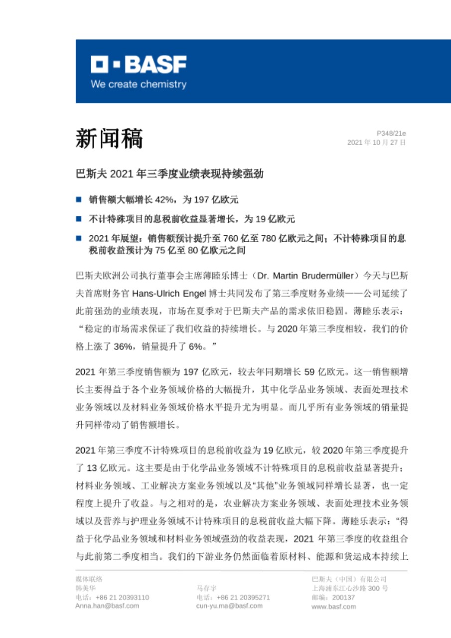 巴斯夫欧洲公司执行董事会主席薄睦乐博士(Dr. Martin Brudermüller)今天与巴斯夫首席财务官Hans-Ulrich Engel博士共同发布了第三季度财务业绩——公司延续了此前强劲的业绩表现,市场在夏季对于巴斯夫产品的需求依旧稳固。薄睦乐表示:“稳定的市场需求保证了我们收益的持续增长。与2020年第三季度相较,我们的价格上涨了36%,销量提升了6%。”