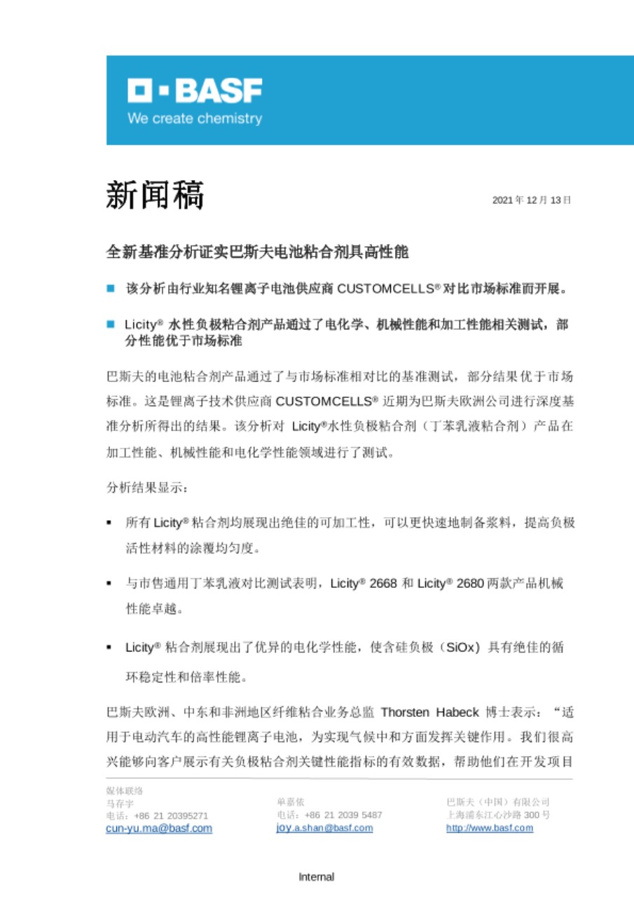 巴斯夫欧洲、中东和非洲地区纤维粘合业务总监Thorsten Habeck博士表示:“适用于电动汽车的高性能锂离子电池,为实现气候中和方面发挥关键作用。我们很高兴能够向客户展示有关负极粘合剂关键性能指标的有效数据,帮助他们在开发项目中提高电池容量和生产效率。”