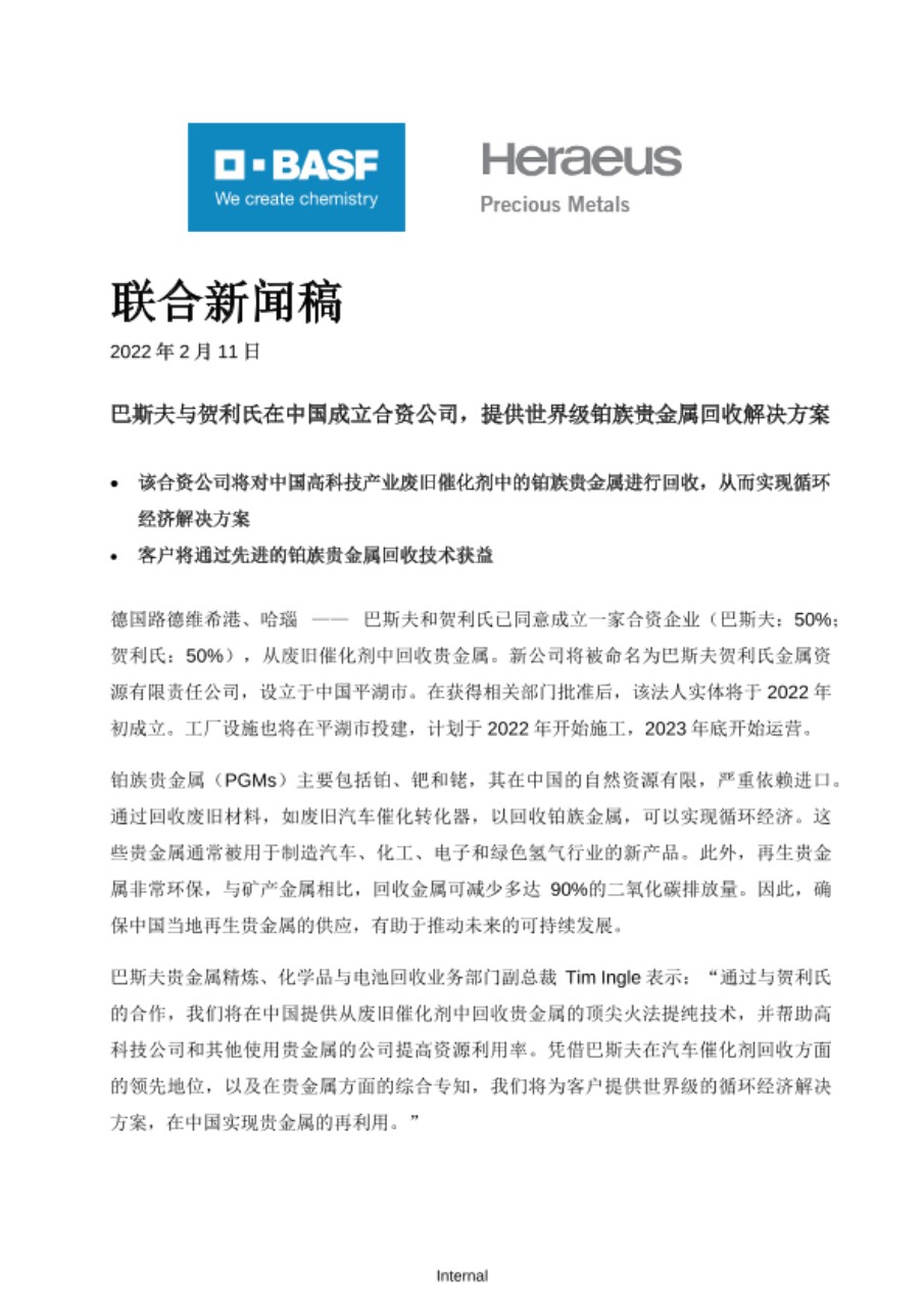 德国路德维希港、哈瑙 —— 巴斯夫和贺利氏已同意成立一家合资企业(巴斯夫:50%;贺利氏:50%),从废旧催化剂中回收贵金属。新公司将被命名为巴斯夫贺利氏金属资源有限责任公司,设立于中国平湖市。在获得相关部门批准后,该法人实体将于2022年初成立。工厂设施也将在平湖市投建,计划于2022年开始施工,2023年底开始运营。