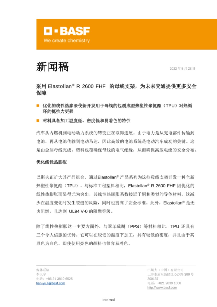 巴斯夫正扩大其产品组合,通过Elastollan® 产品系列为这些母线支架开发一种全新热塑性聚氨酯(TPU)。与标准工程塑料相比,Elastollan® R 2600 FHF 因优化的线性热膨胀而显得尤为突出,其线性热膨胀系数接近于铜和类似的导体材料。这减少在温度变化时发生裂缝的风险,同时也提高了安全标准。此外,Elastollan® 是无卤阻燃,且达到 UL94 V-0 的阻燃等级。