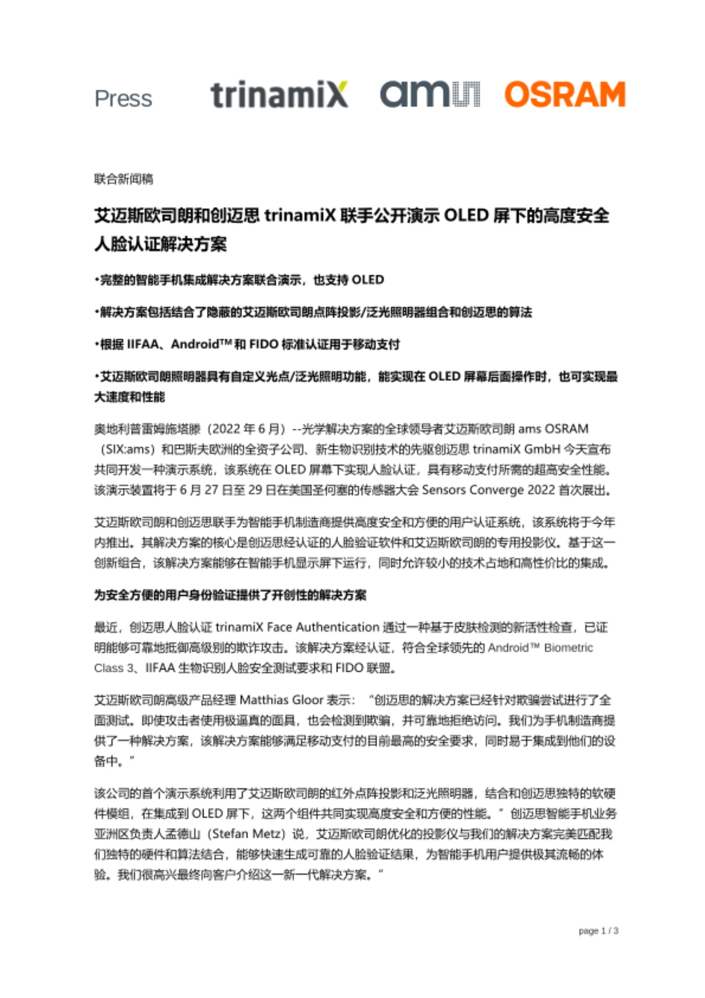 奥地利普雷姆施塔滕( 2022 年 6 月)—— 光学解决方案的全球领导者艾迈斯欧司朗 ams OSRAM(SIX:ams)和巴斯夫欧洲的全资子公司、新生物识别技术的先驱创迈思 trinamiX GmbH 今天宣布共同开发一种演示系统,该系统在 OLED 屏幕下实现人脸认证,具有移动支付所需的超高安全性能。该演示装置将于 6 月 27 日至 29 日在美国圣何塞的传感器大会 Sensors Converge 2022 首次展出。