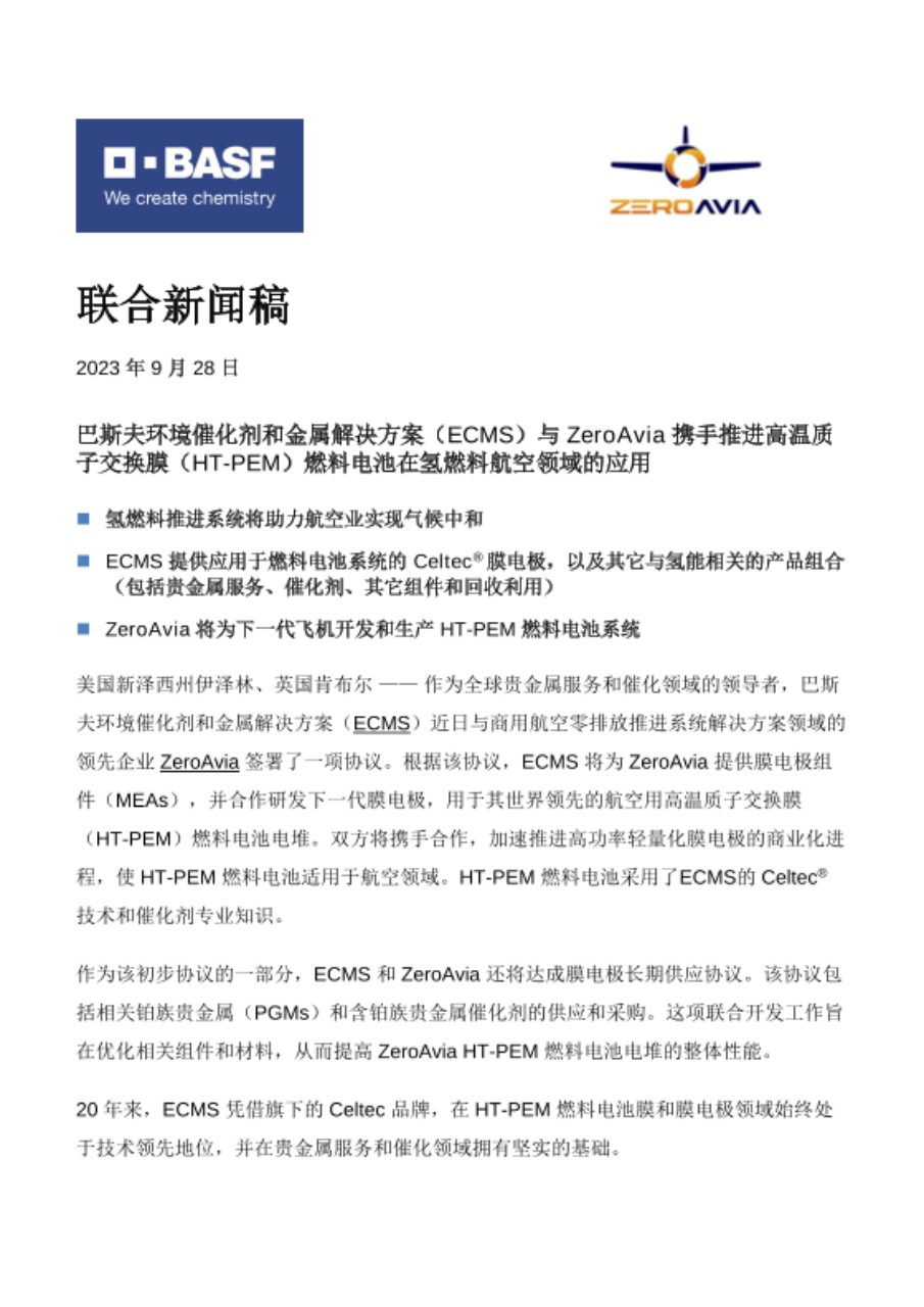 巴斯夫环境催化剂和金属解决方案(ECMS)与 ZeroAvia 携手推进高温质子交换膜(HT-PEM)燃料电池在氢燃料航空领域的应用