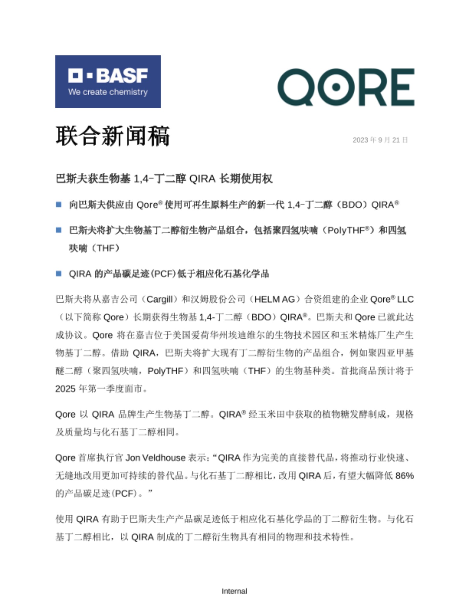 联合新闻稿: 巴斯夫获生物基 1,4-丁二醇 QIRA 长期使用权