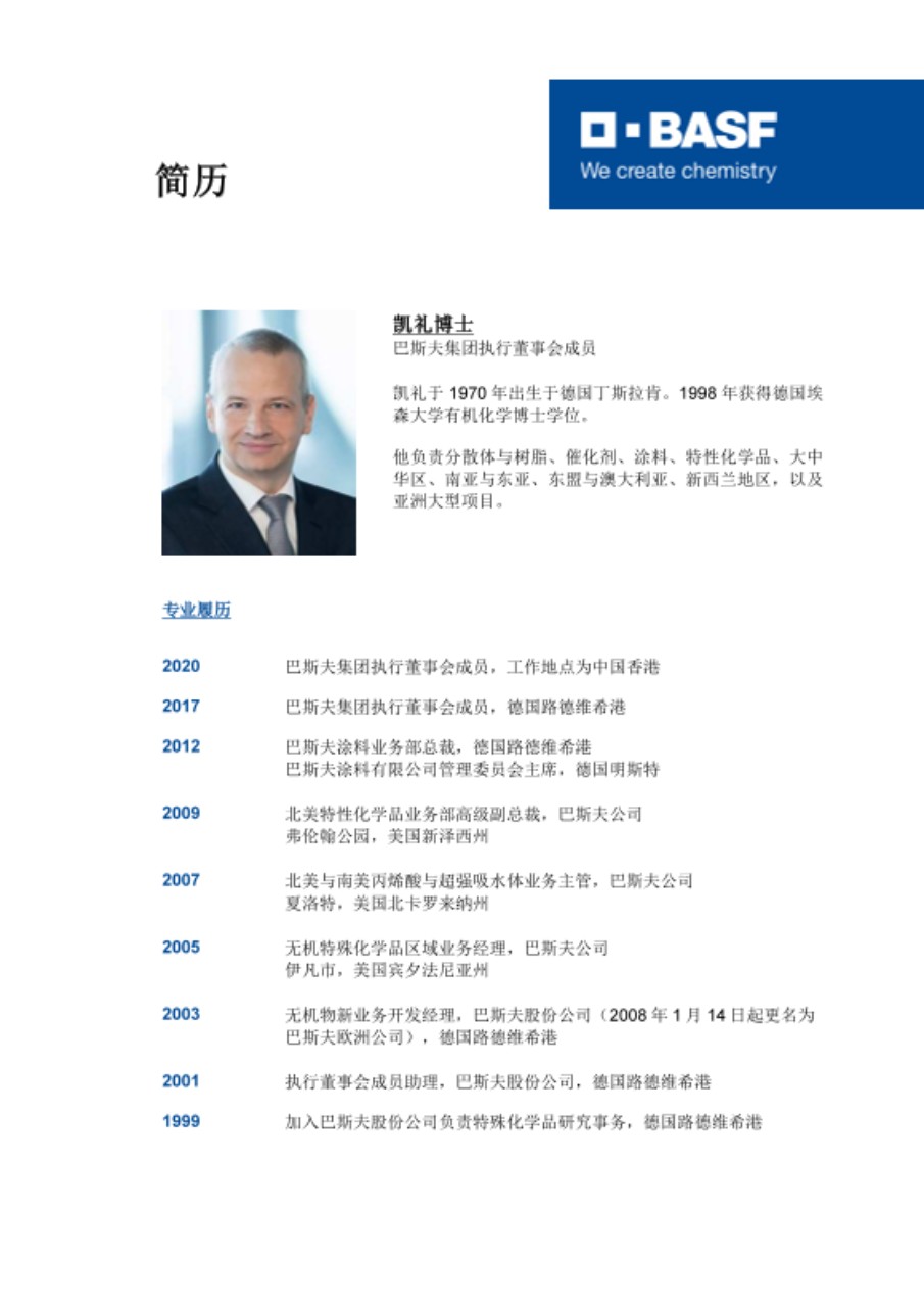 巴斯夫管理层人员变更:2024 年凯礼接替薄睦乐出任巴斯夫集团执行董事会主席