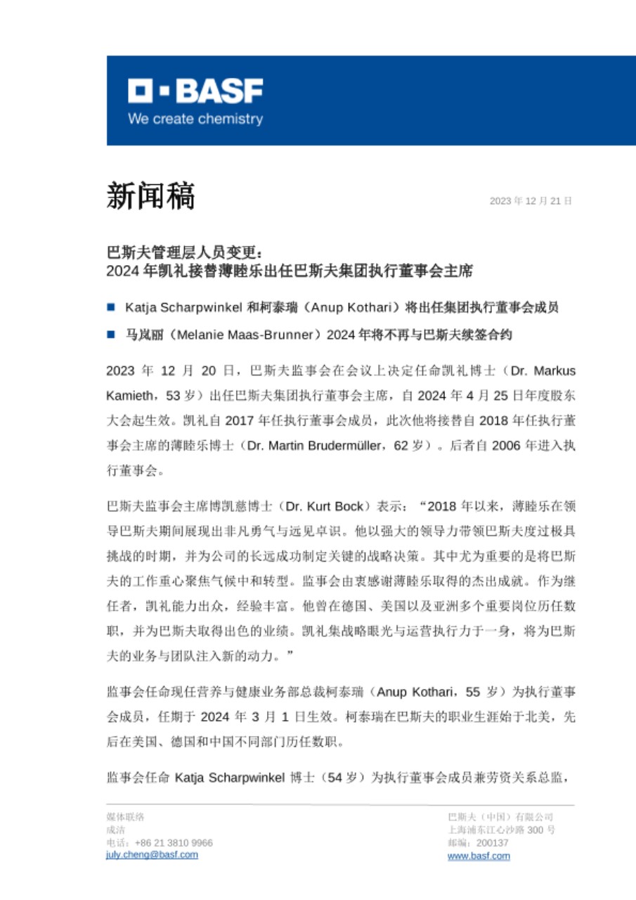 2023 年 12 月 20 日,巴斯夫监事会在会议上决定任命凯礼博士(Dr. Markus Kamieth,53岁)出任巴斯夫集团执行董事会主席,自 2024 年 4 月 25 日年度股东大会起生效。凯礼自 2017 年任执行董事会成员,此次他将接替自 2018 年任执行董事会主席的薄睦乐博士(Dr. Martin Brudermüller,62岁)。后者自 2006 年进入执行董事会。