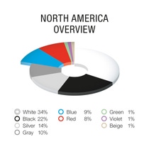 与欧洲、中东和非洲地区一样,北美地区的非彩色色系——白色、黑色、银色和灰色——也增长了 2%。在汽车制造商取消了几种灰色色调后,消费者转而开始青睐银色等浅色色调。