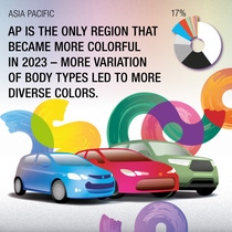 与 2022 年相比,彩色色系在亚太地区的市场份额略有上升,大部分汽车新色调仍来自彩色色系。绿色等自然色的市场份额同样有所增加。浅灰色和银色等浅色也越来越受欢迎。