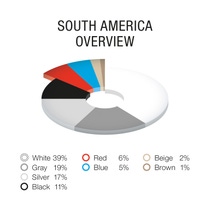 南美地区历来对彩色持保守态度,2023 年该地区的非彩色色系色彩仍占据很大的比例。在南美地区的新车中,共有 86% 的车身为白色、黑色、银色或灰色,在所有地区中位列第一。其中,银色的比例最高。