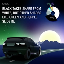 作为传统意义上的基础汽车色彩,非彩色色系正在经历重大变革:白色仍是轻型乘用车最受欢迎的车身颜色,但市场份额已明显下降。黑色抢占白色市场份额,变得日趋流行。
