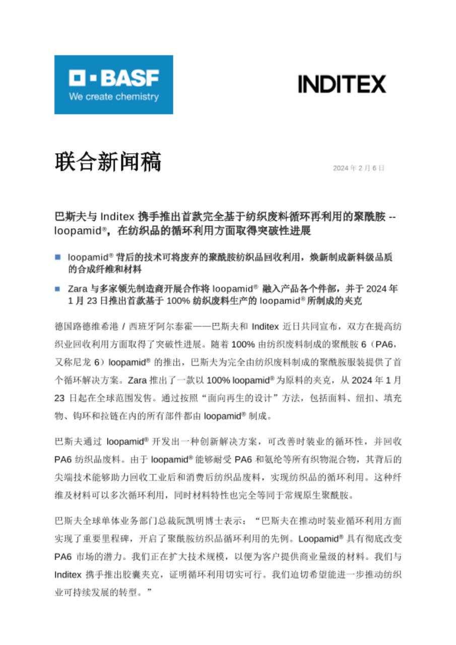 德国路德维希港 / 西班牙阿尔泰霍——巴斯夫和 Inditex 近日共同宣布,双方在提高纺织业回收利用方面取得了突破性进展。随着 100% 由废旧纺织品制成的聚酰胺 6(PA6,又称尼龙 6)loopamid® 的推出,巴斯夫为完全由废旧纺织品制成的聚酰胺服装提供了首个循环解决方案。Zara 推出了一款以100% loopamid® 为原料的夹克,从 2024 年 1 月 23 日起在全球范围发售。通过按照“面向再生的设计”方法,包括面料、纽扣、填充物、钩环和拉链在内的所有部件都由 loopamid® 制成。