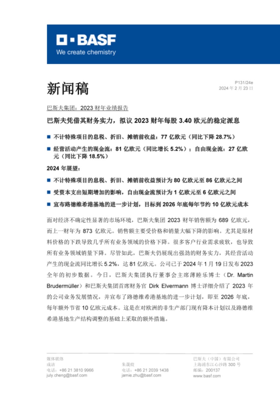 面对经济不确定性显著的市场环境,巴斯夫集团 2023 财年销售额为 689 亿欧元,而上一财年为 873 亿欧元。销售额主要受价格和销量大幅下降的影响。尤其是原材料价格的下跌导致几乎所有业务领域的价格下降。很多客户行业需求疲软,也导致所有业务领域销量下降。尽管如此,巴斯夫仍展现出强劲的财务实力,其经营活动产生的现金流同比增长 5.2%,达 81 亿欧元。公司已于 2024 年 1 月 19 日发布 2023 全年的初步数据。今日,巴斯夫集团执行董事会主席薄睦乐博士(Dr. Martin Brudermüller)和巴斯夫集团首席财务官 Dirk Elvermann 博士详细介绍了 2023 年的公司业务发展情况,并宣布了路德维希港基地的进一步计划,即至 2026 年底,每年额外节省 10 亿欧元成本。这是在对欧洲的非生产部门现有降本计划以及路德维希港基地生产结构调整的基础上采取的额外措施。