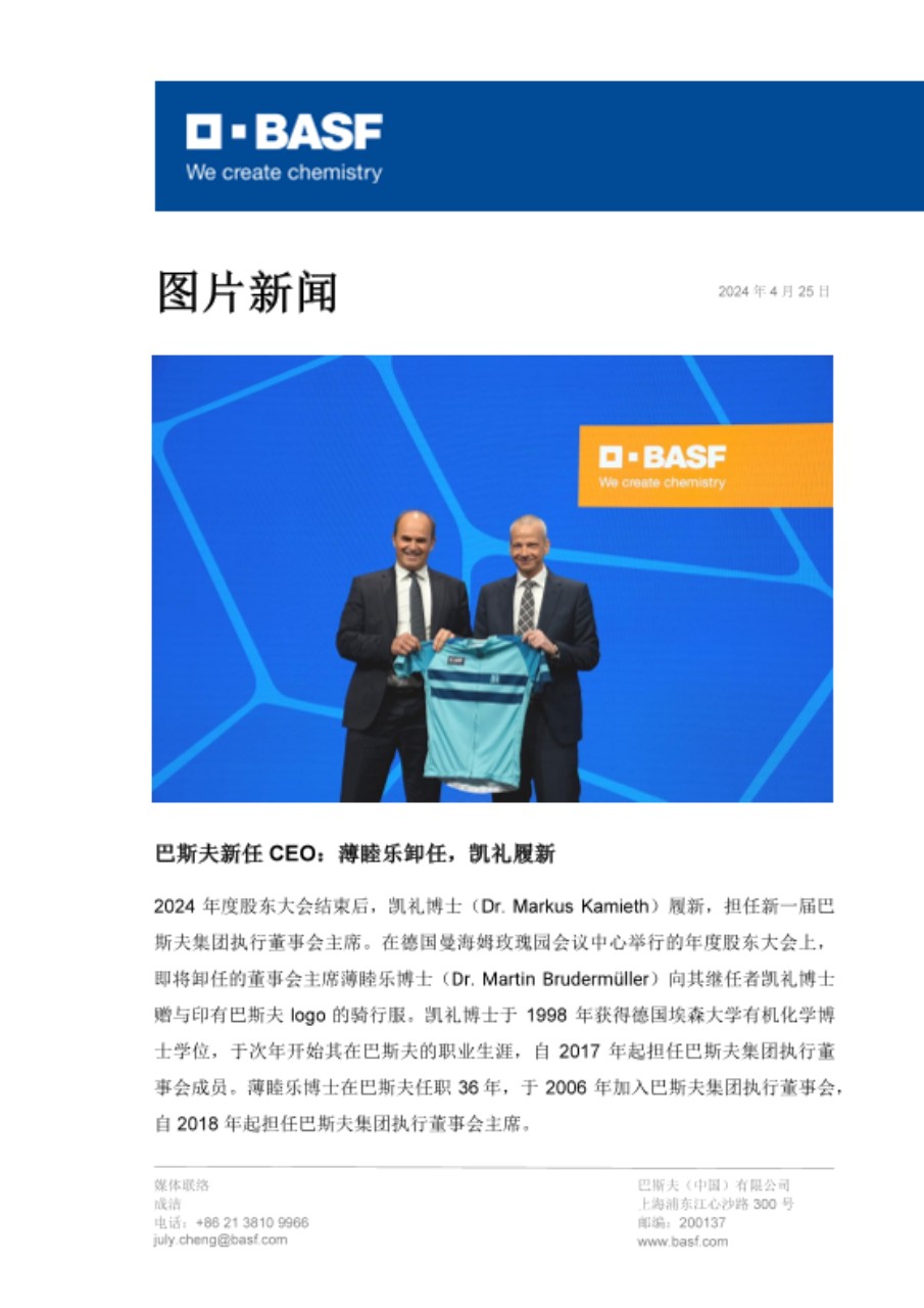 2024 年度股东大会结束后,凯礼博士(Dr. Markus Kamieth)履新,担任新一届巴斯夫集团执行董事会主席。在德国曼海姆玫瑰园会议中心举行的年度股东大会上,即将卸任的董事会主席薄睦乐博士(Dr. Martin Brudermüller)向其继任者凯礼博士赠与印有巴斯夫logo 的骑行服。凯礼博士于 1998 年获得德国埃森大学有机化学博士学位,于次年开始其在巴斯夫的职业生涯,自 2017 年起担任巴斯夫集团执行董事会成员。薄睦乐博士在巴斯夫任职 36年,于 2006 年加入巴斯夫集团执行董事会,自2018 年起担任巴斯夫集团执行董事会主席。