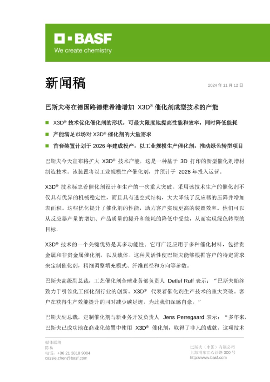 巴斯夫副总裁,定制催化剂与新业务开发负责人 Jens Perregaard 表示:“多年来,巴斯夫已成功地在商业化装置中使用 X3D® 催化剂,取得了非凡的成就。这项技术有望以极高的效率和更快的市场响应速度,为绿色和传统价值链塑造未来。”