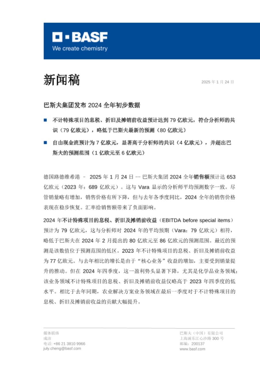 巴斯夫集团发布 2024 全年初步数据