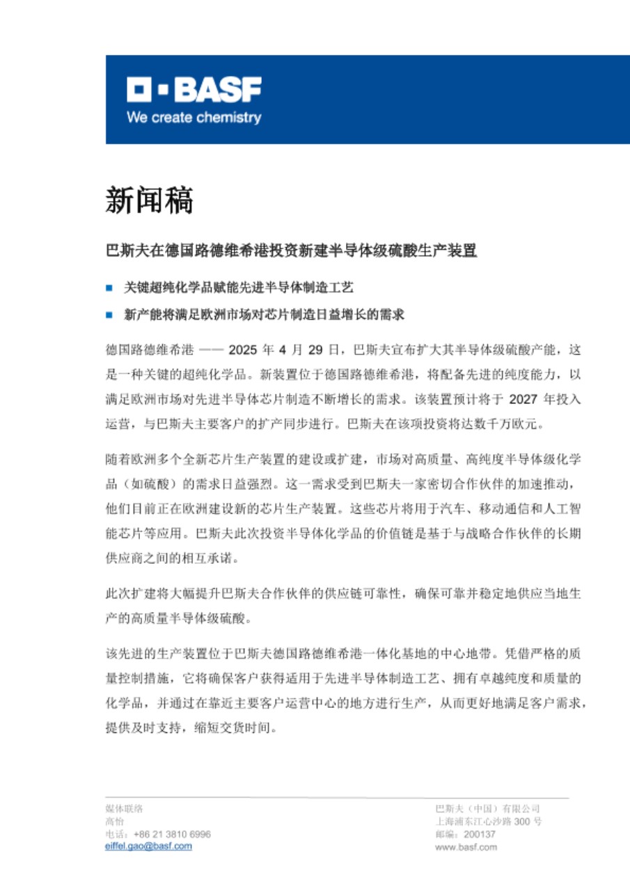 随着欧洲多个全新芯片生产装置的建设或扩建,市场对高质量、高纯度半导体级化学品(如硫酸)的需求日益强烈。这一需求受到巴斯夫一家密切合作伙伴的加速推动,他们目前正在欧洲建设新的芯片生产装置。这些芯片将用于汽车、移动通信和人工智能芯片等应用。巴斯夫此次投资半导体化学品的价值链是基于与战略合作伙伴的长期供应商之间的相互承诺。