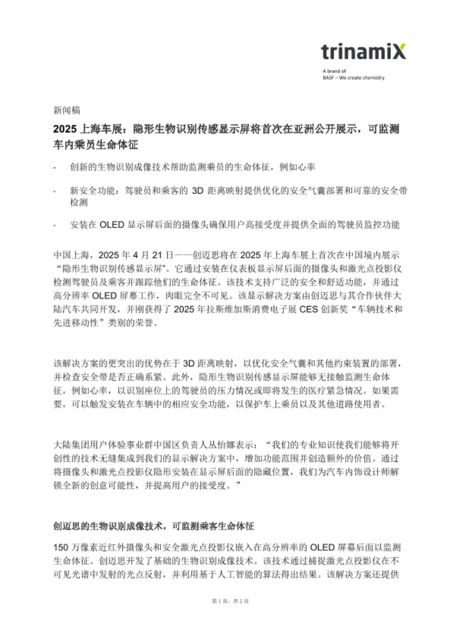 中国上海,2025 年 4 月 21 日——创迈思将在 2025 年上海车展上首次在中国境内展示“隐形生物识别传感显示屏”。它通过安装在仪表板显示屏后面的摄像头和激光点投影仪检测驾驶员及乘客并跟踪他们的生命体征。该技术支持广泛的安全和舒适功能,并通过高分辨率 OLED 屏幕工作,肉眼完全不可见。该显示解决方案由创迈思与其合作伙伴大陆汽车共同开发,并刚获得了 2025 年拉斯维加斯消费电子展 CES 创新奖“车辆技术和先进移动性”类别的荣誉。
