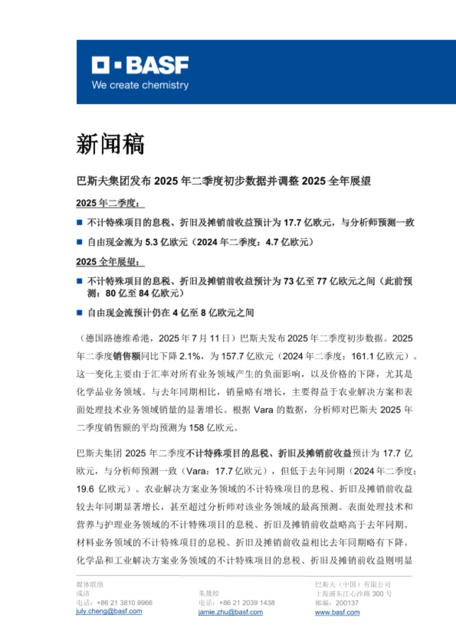 巴斯夫集团发布 2025 年二季度初步数据并调整 2025 全年展望