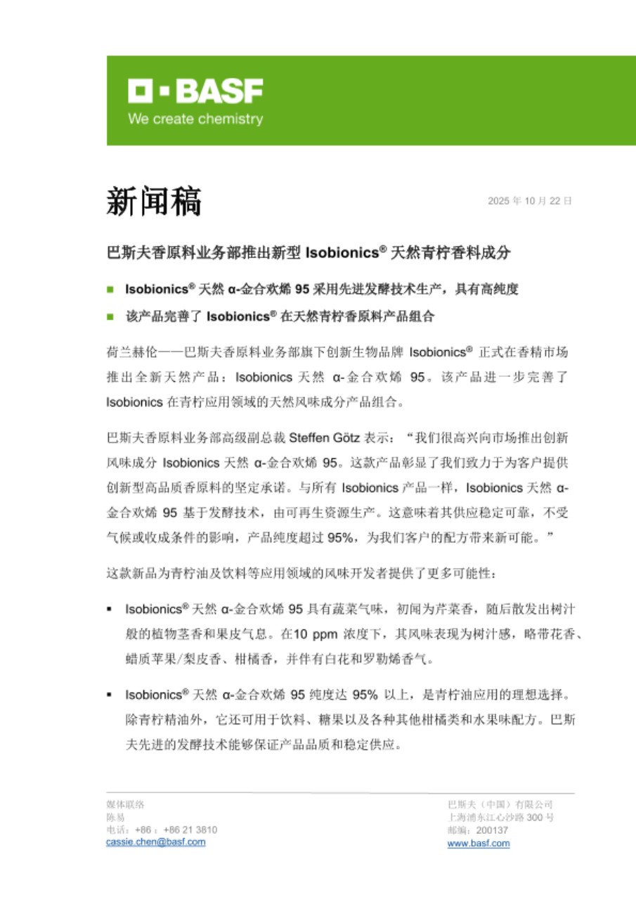 荷兰赫伦——巴斯夫香原料业务部旗下创新生物品牌 Isobionics® 正式在香精市场推出全新天然产品:Isobionics 天然 α-金合欢烯 95。该产品进一步完善了 Isobionics 在青柠应用领域的天然风味成分产品组合。