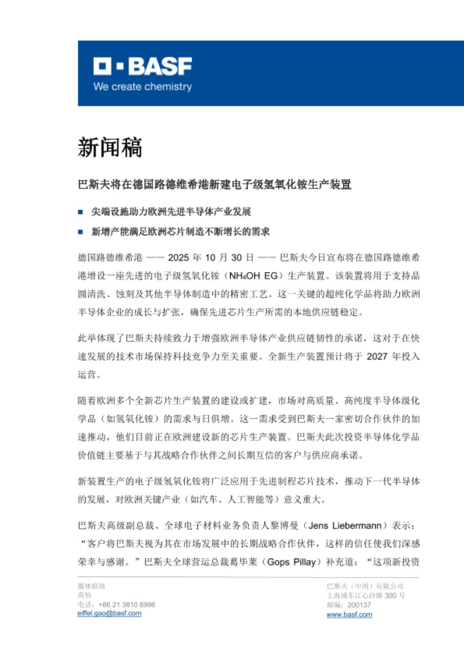 德国路德维希港 —— 2025 年 10 月 30 日 —— 巴斯夫今日宣布将在德国路德维希港增设一座先进的电子级氢氧化铵(NH4OH EG)生产装置。该装置将用于支持晶圆清洗、蚀刻及其他半导体制造中的精密工艺。这一关键的超纯化学品将助力欧洲半导体企业的成长与扩张,确保先进芯片生产所需的本地供应链稳定。